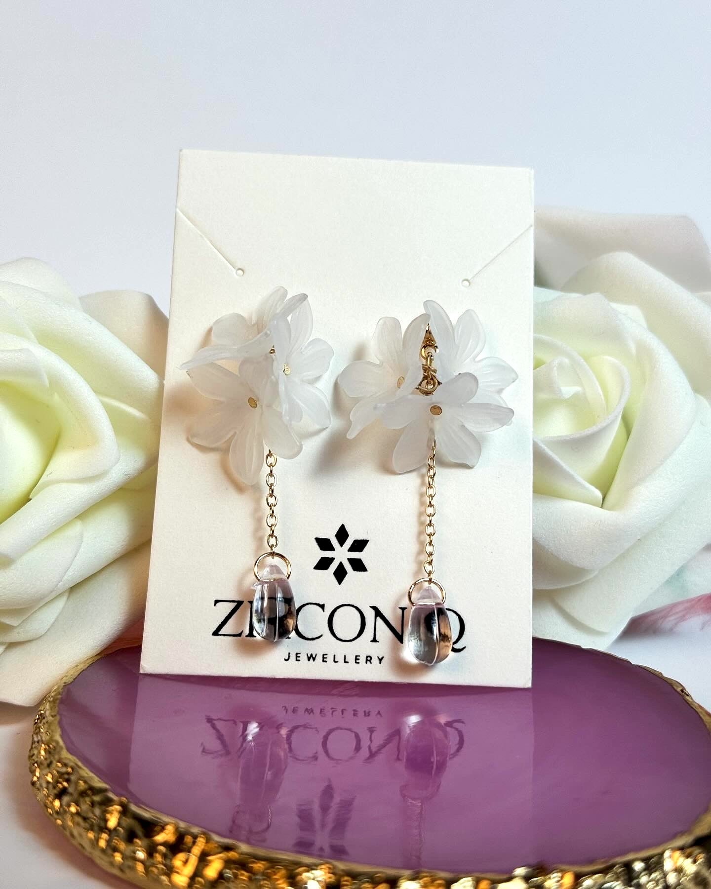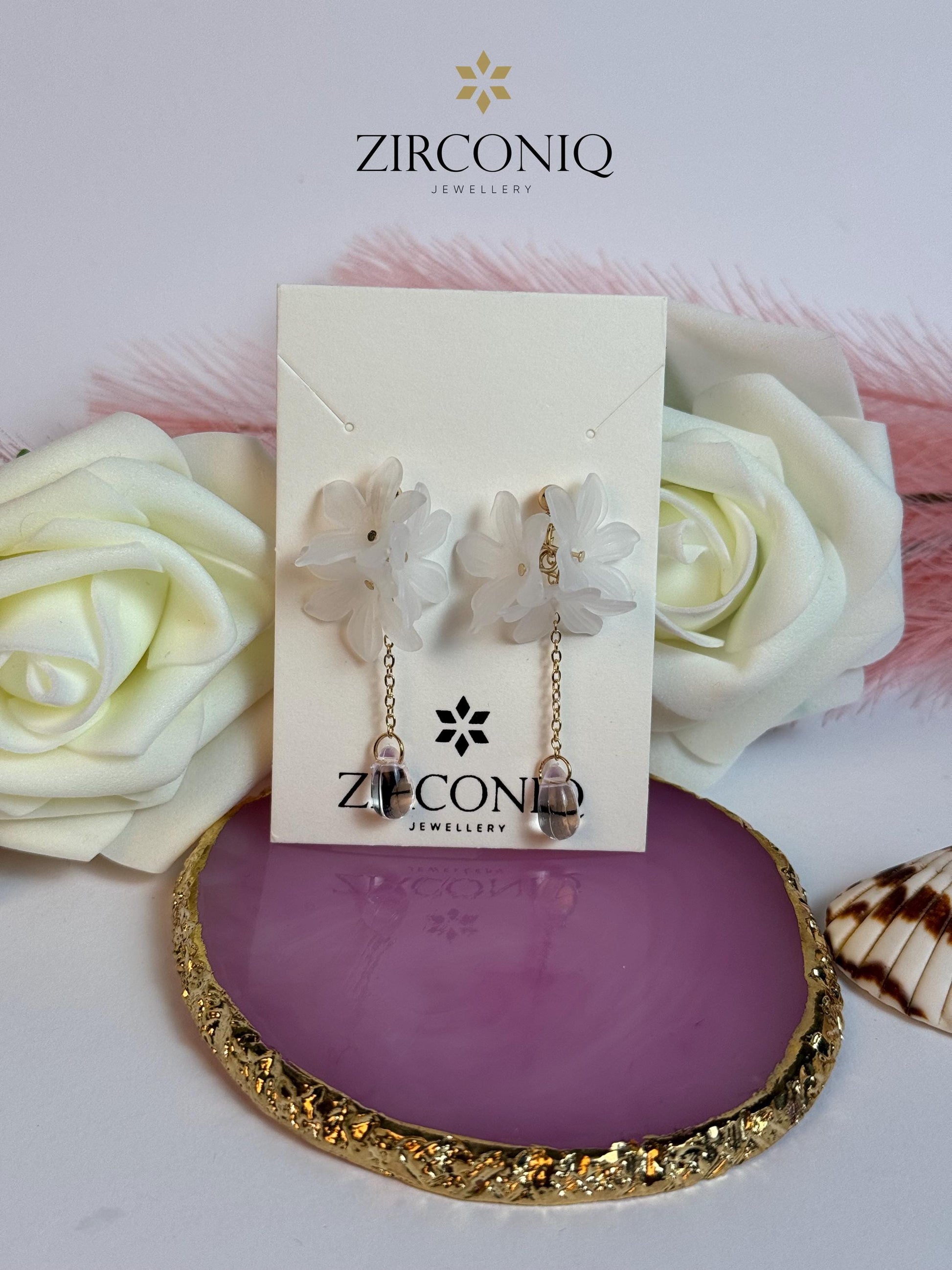 Elegante weiße Blumen-Ohrhänger mit Kristalltropfen
